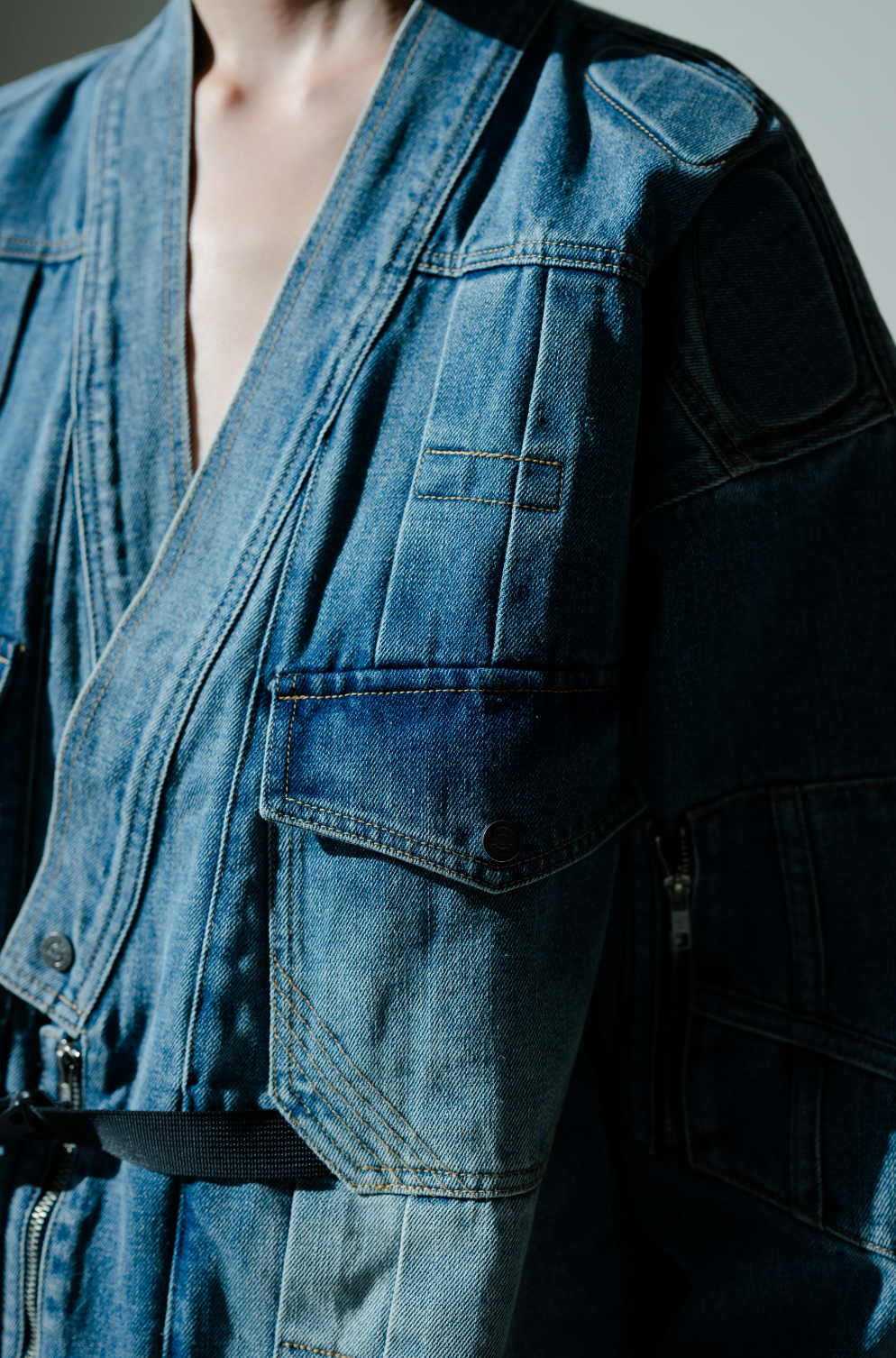 This denim kimono jacket combines traditional Japanese-inspired design with a modern streetwear aesthetic. Made from mid-wash blue denim, it features a relaxed silhouette, front flap pockets, and a belted waist for adjustable styling. The faded wash and structured stitching add a vintage edge, while the kimono-style neckline gives it a unique and contemporary look. Perfect as a statement outerwear piece that blends heritage and urban style.