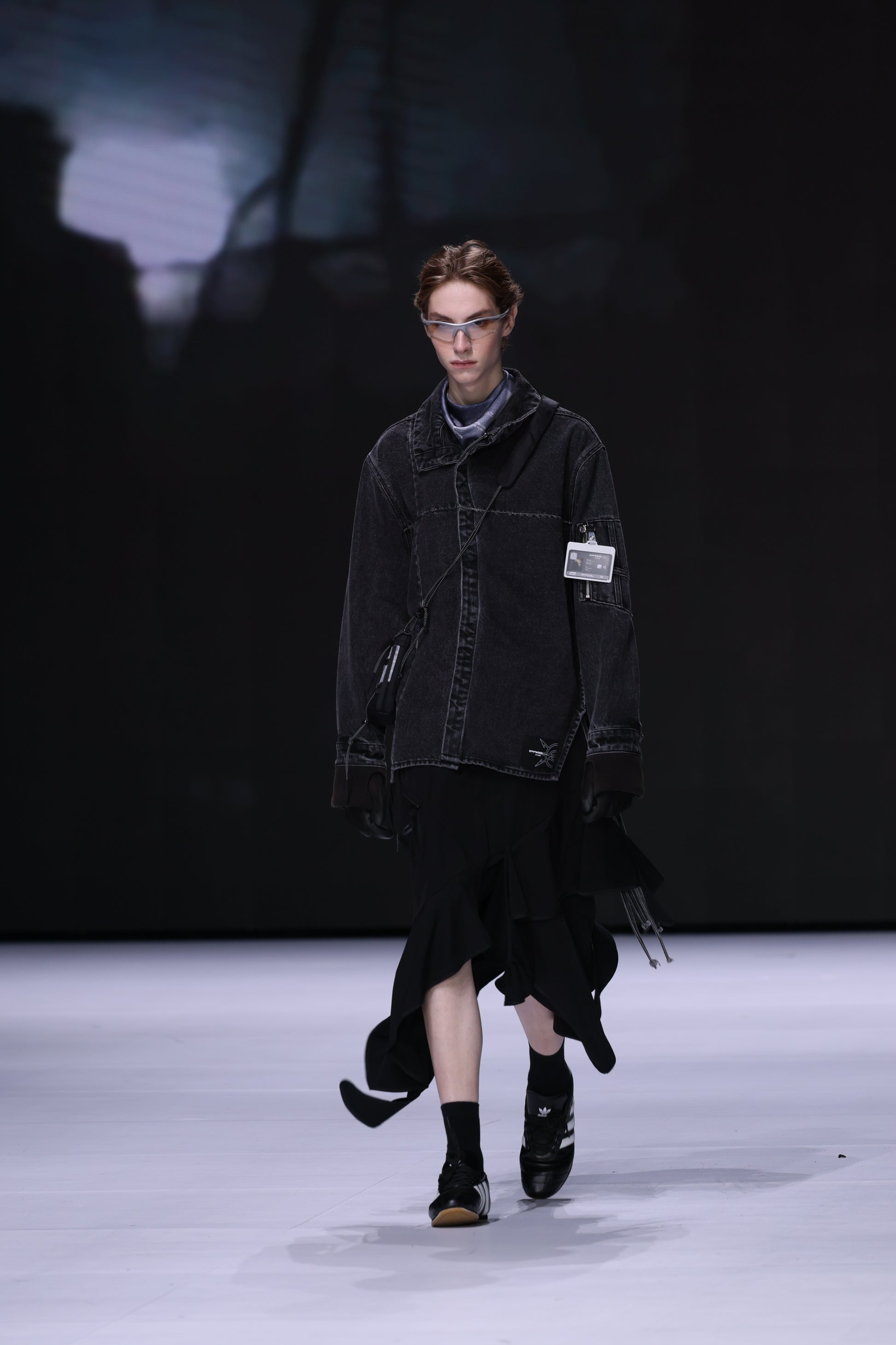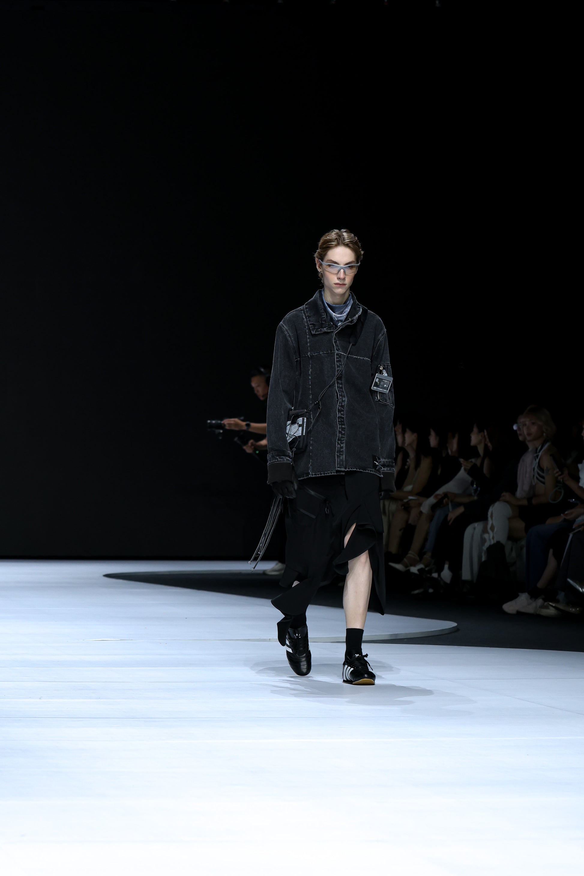 This water-repellent long skirt combines a functional workwear structure with an avant-garde asymmetric silhouette.