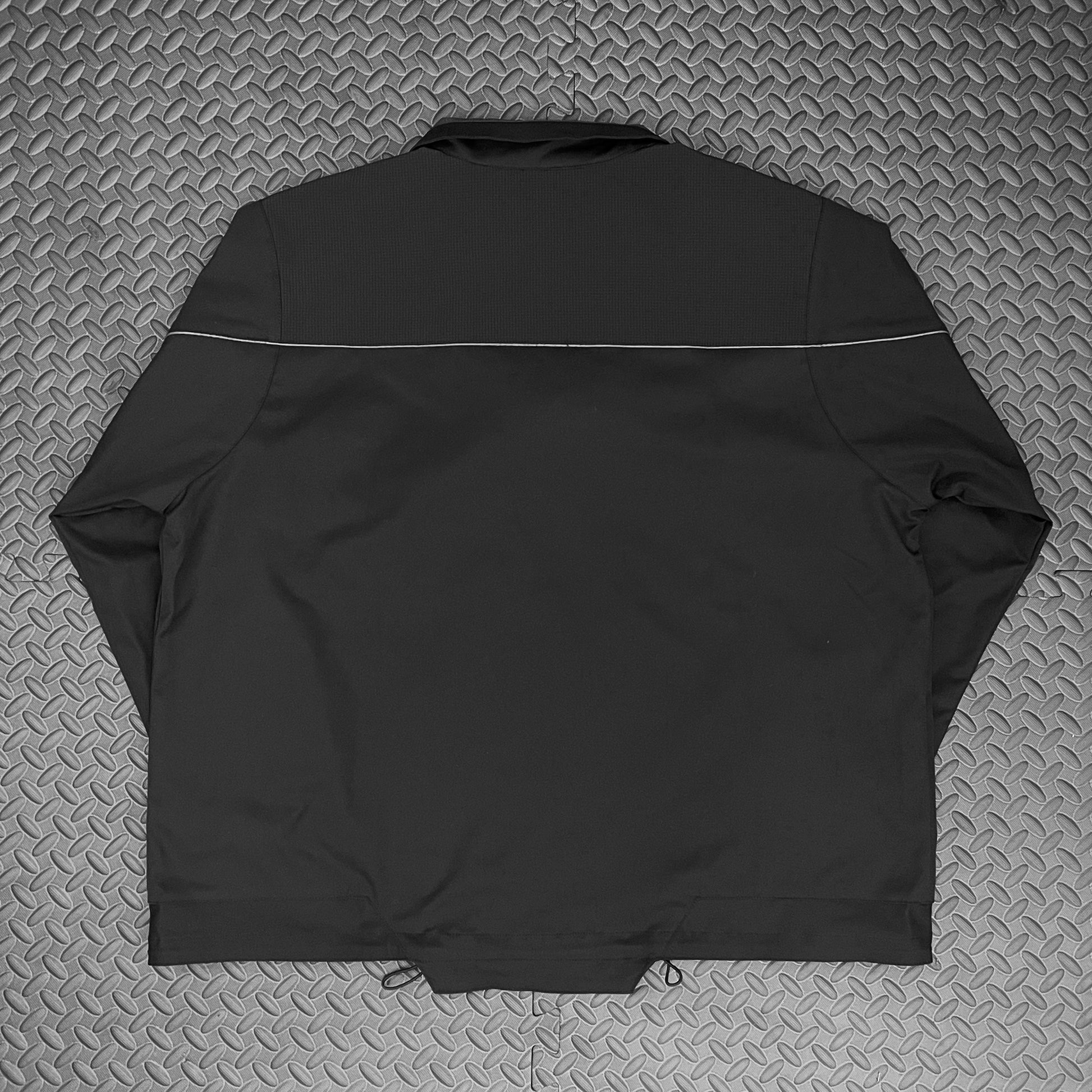 Inspired by F1 pilot jackets, the design features a loose-fitting silhouette. The hem has an adjustable elastic drawstring for customized tightness. The cuff area is stitched with protective padding details. Additionally, the shoulder area features three-dimensional embroidered patterns, simulating a futuristic military style.