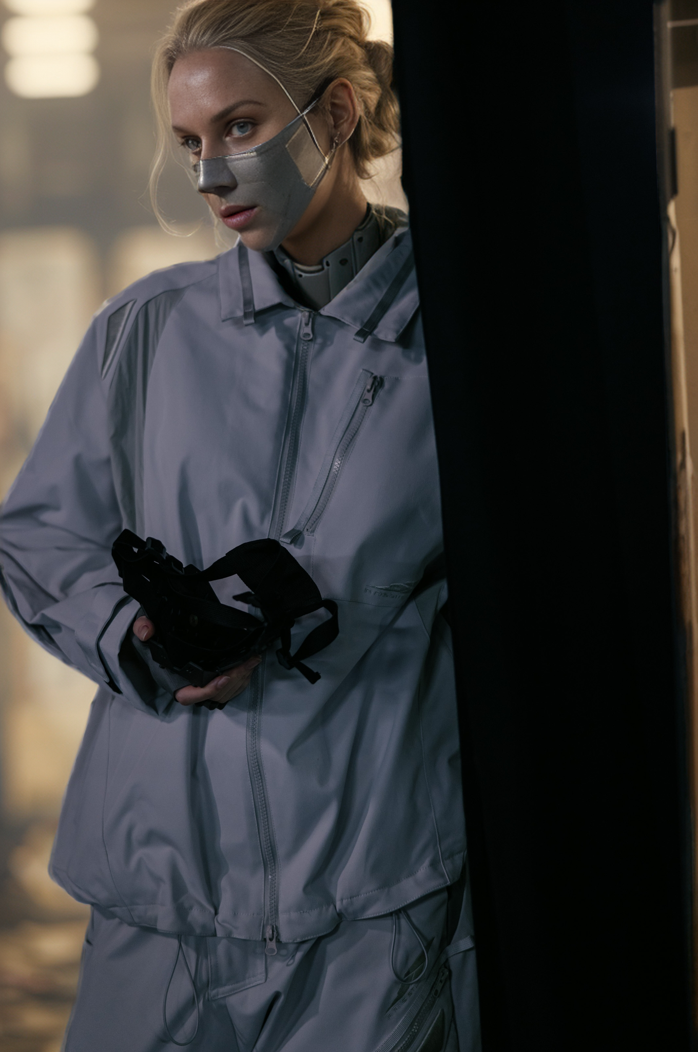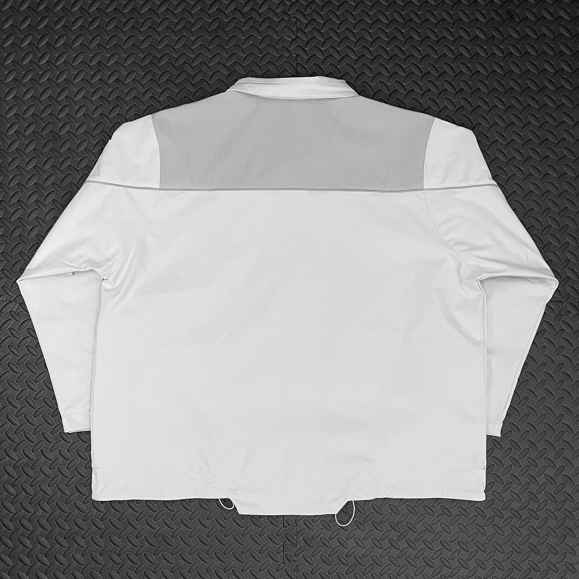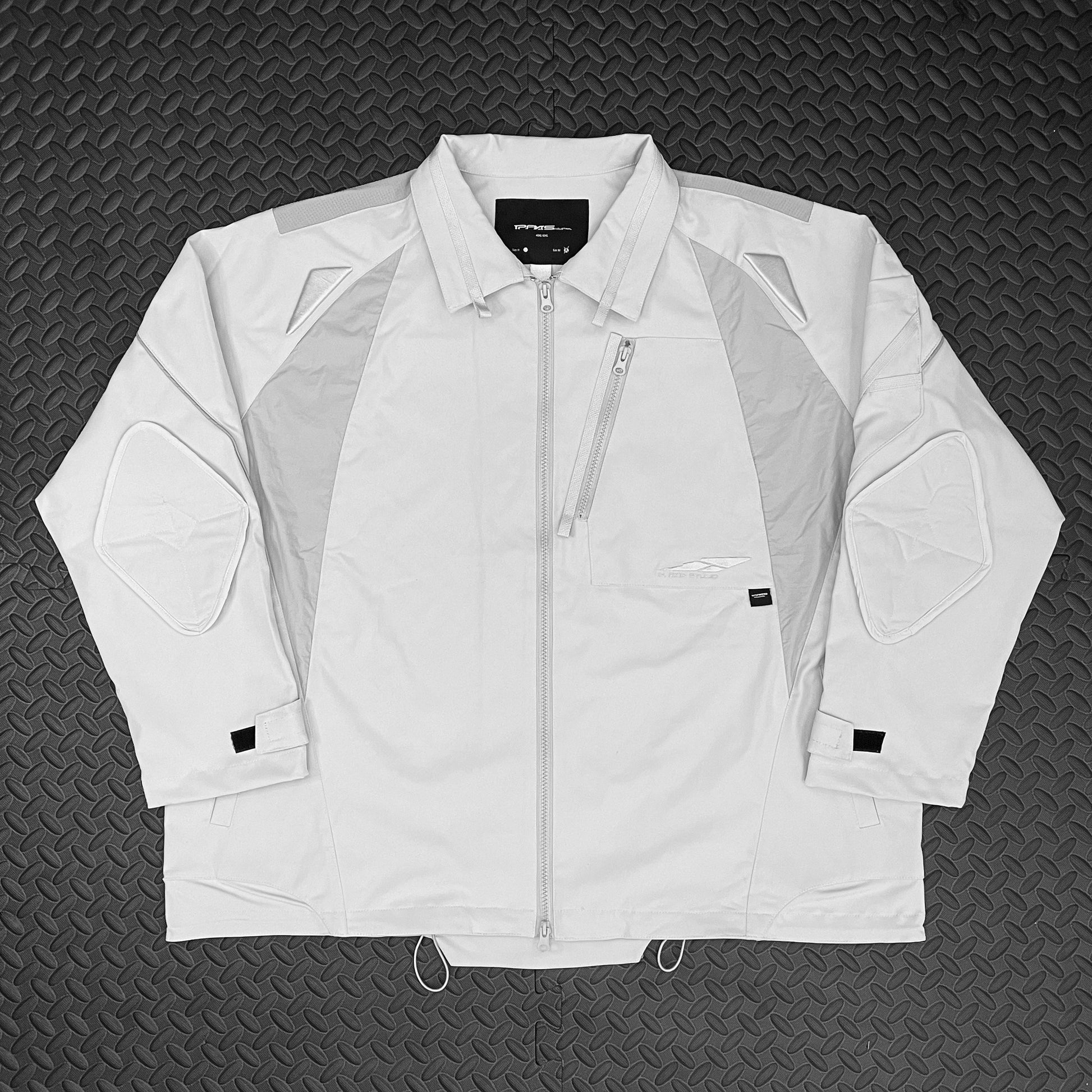 Inspired by F1 pilot jackets, the design features a loose-fitting silhouette. The hem has an adjustable elastic drawstring for customized tightness. The cuff area is stitched with protective padding details. Additionally, the shoulder area features three-dimensional embroidered patterns, simulating a futuristic military style.