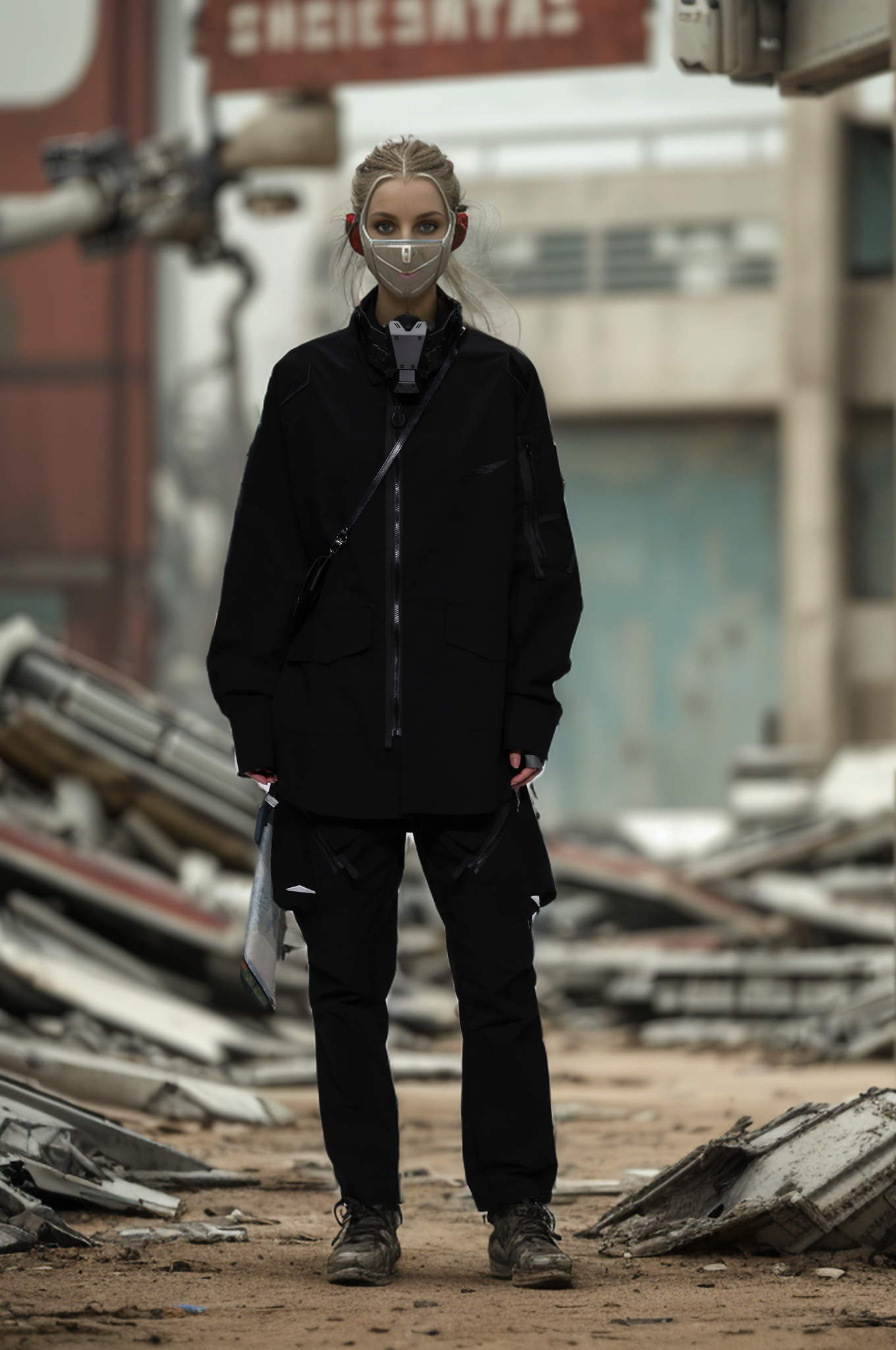 Inspired by F1 pilot jackets, the design features a loose-fitting silhouette. The hem has an adjustable elastic drawstring for customized tightness. The cuff area is stitched with protective padding details. Additionally, the shoulder area features three-dimensional embroidered patterns, simulating a futuristic military style.