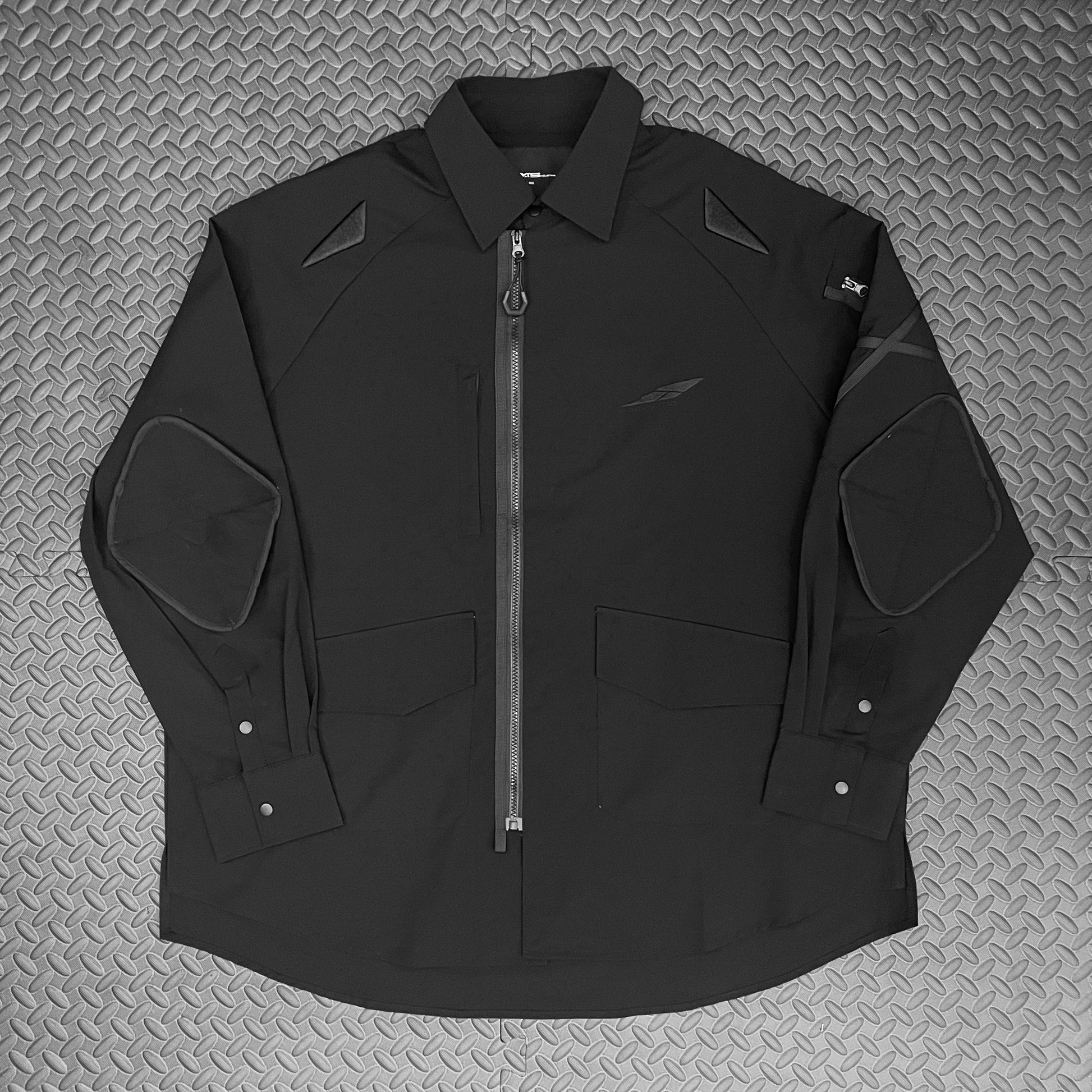 The cuff area is stitched with protective padding details. Additionally, the shoulder area features three-dimensional embroidered patterns, simulating a futuristic military style.
