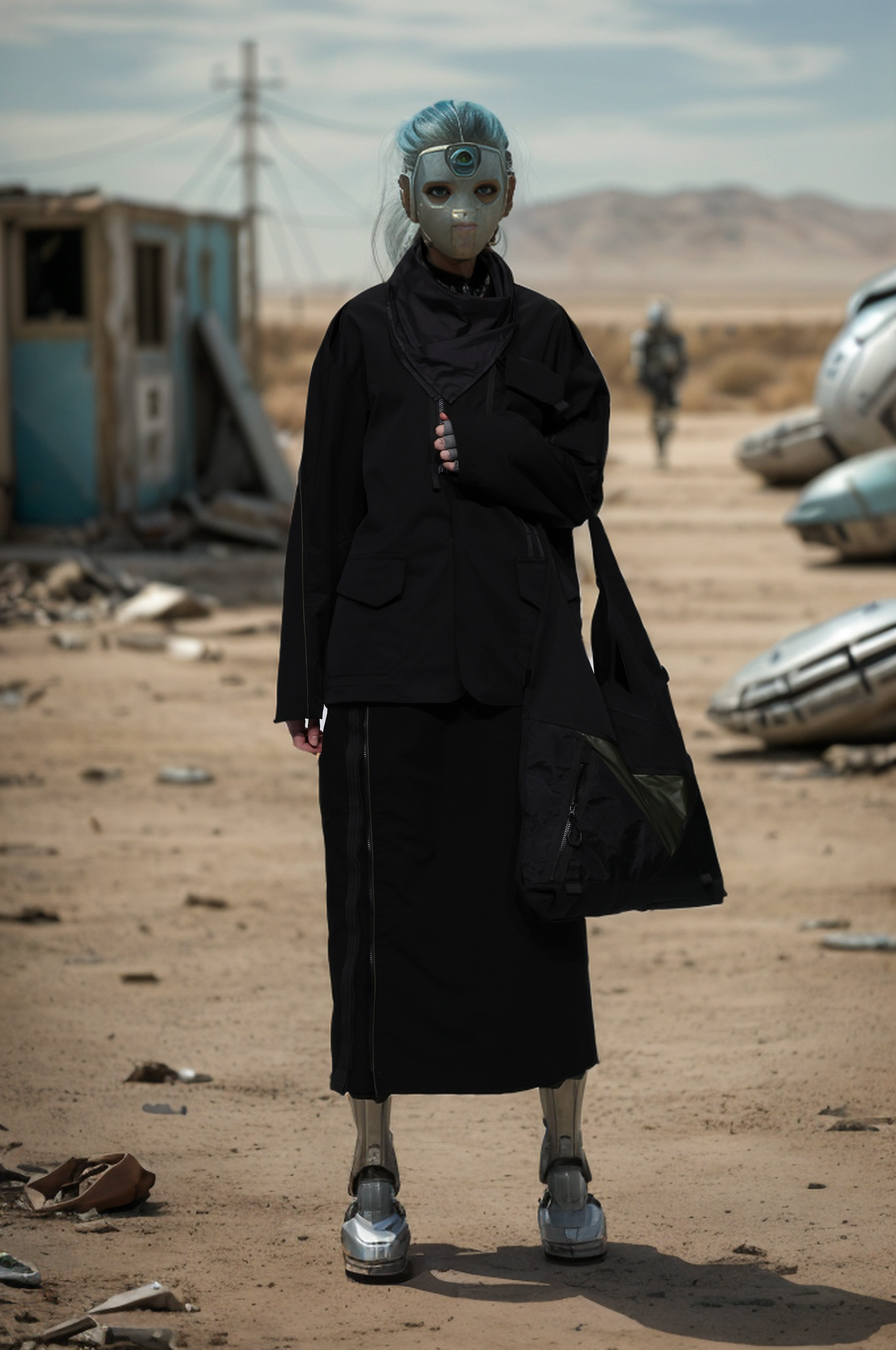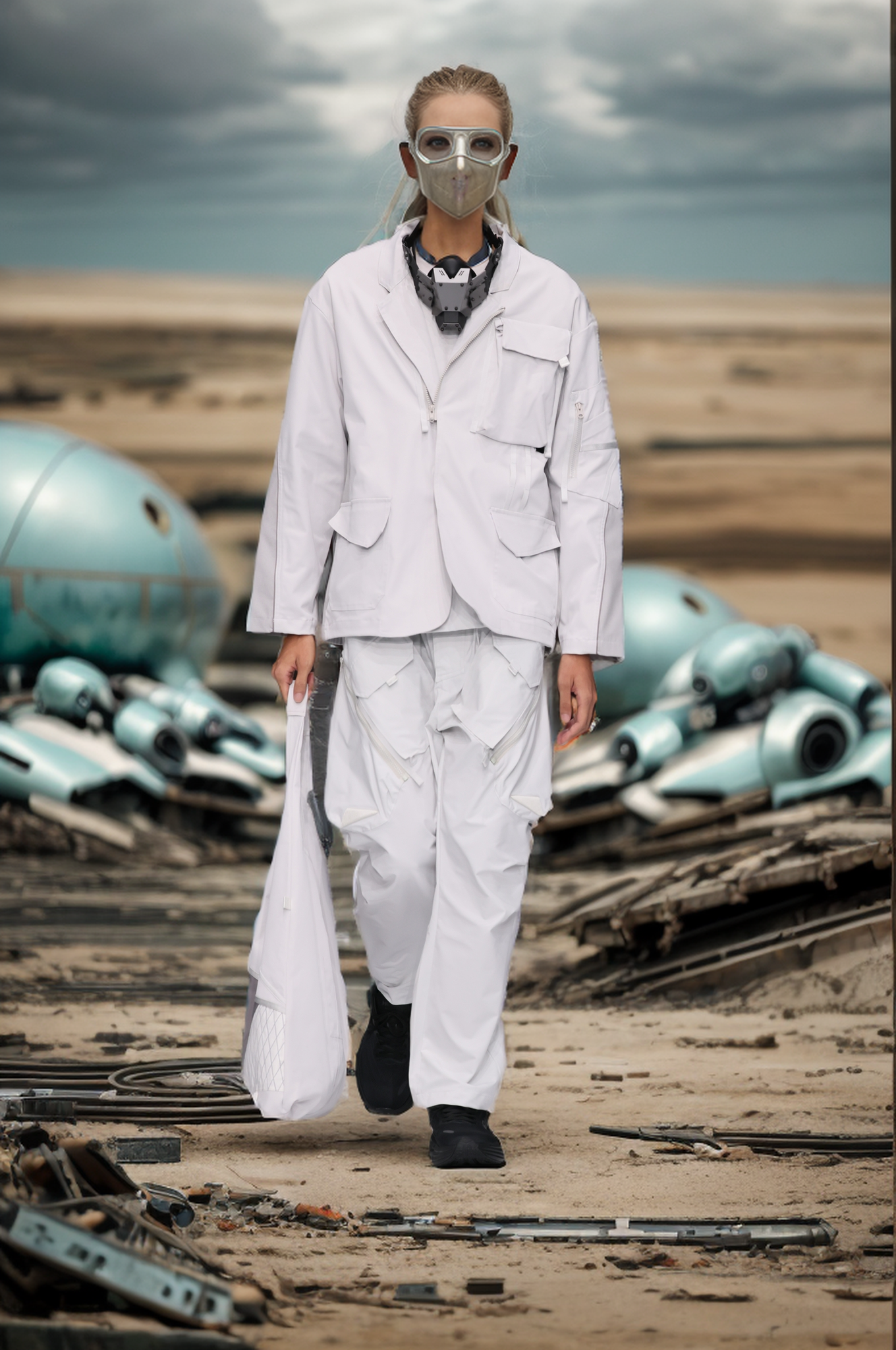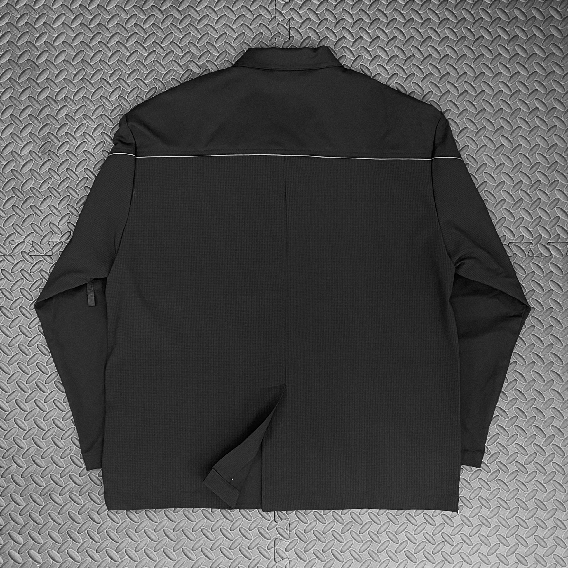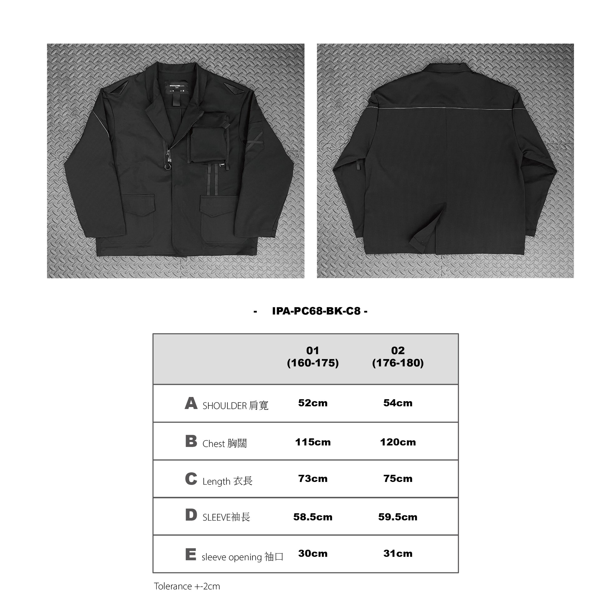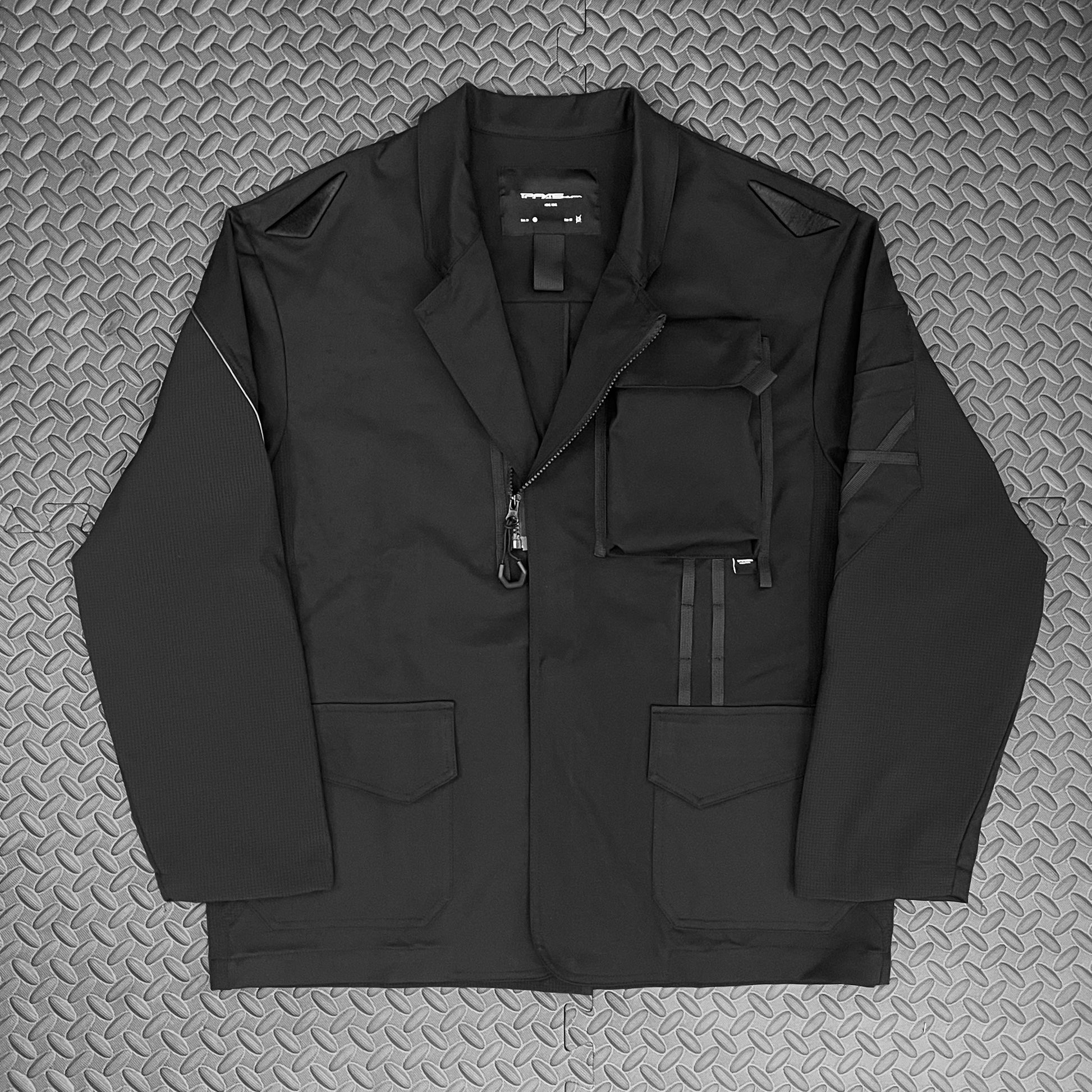 Futuristic workwear suit jacket with a tailored cut, using fabric panels in matching colors.