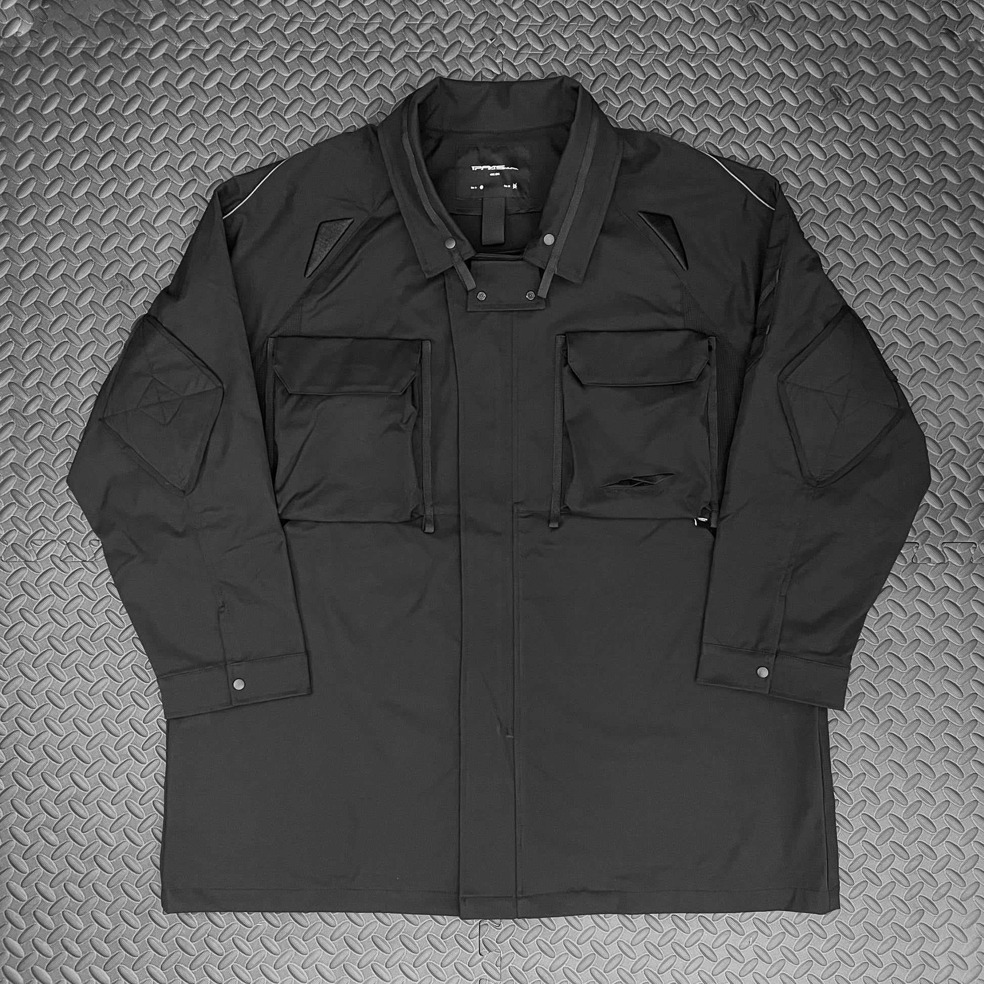 Inspired by German military uniforms, the coat features a silhouette that offers three collar styles: stand-up, turned-down, and suit collar. It combines traditional military design with futuristic elements.
