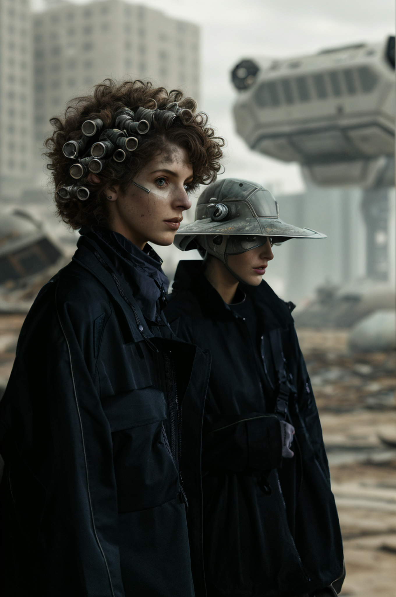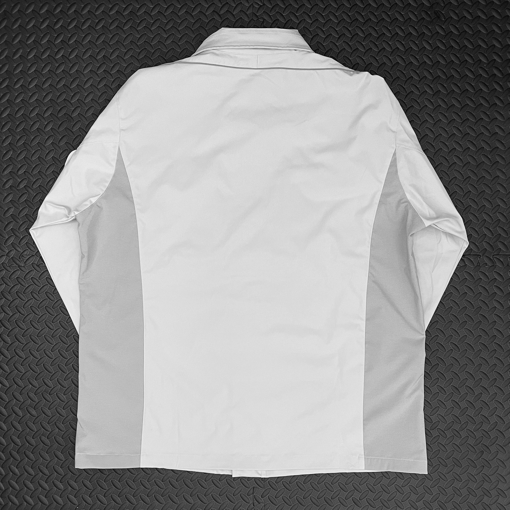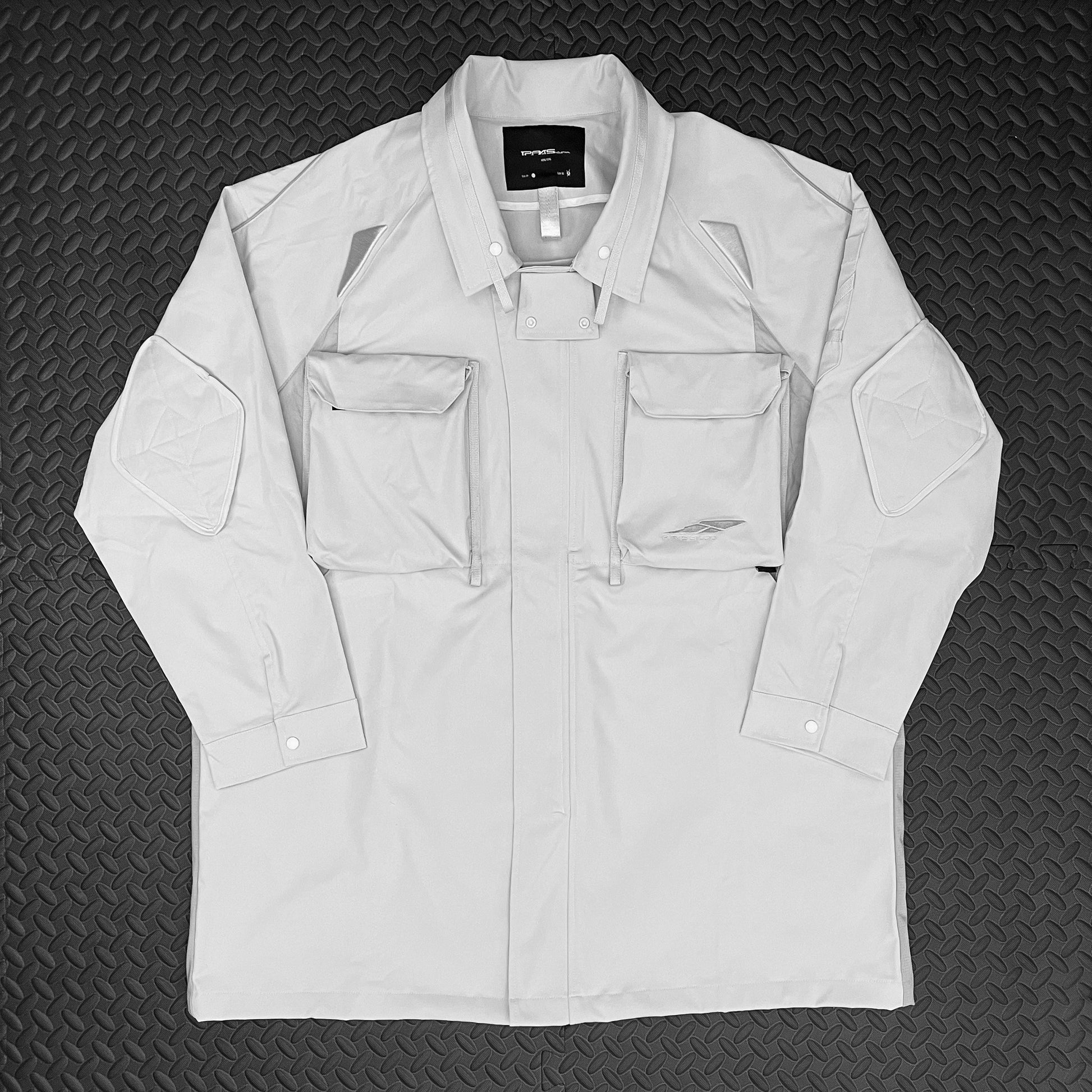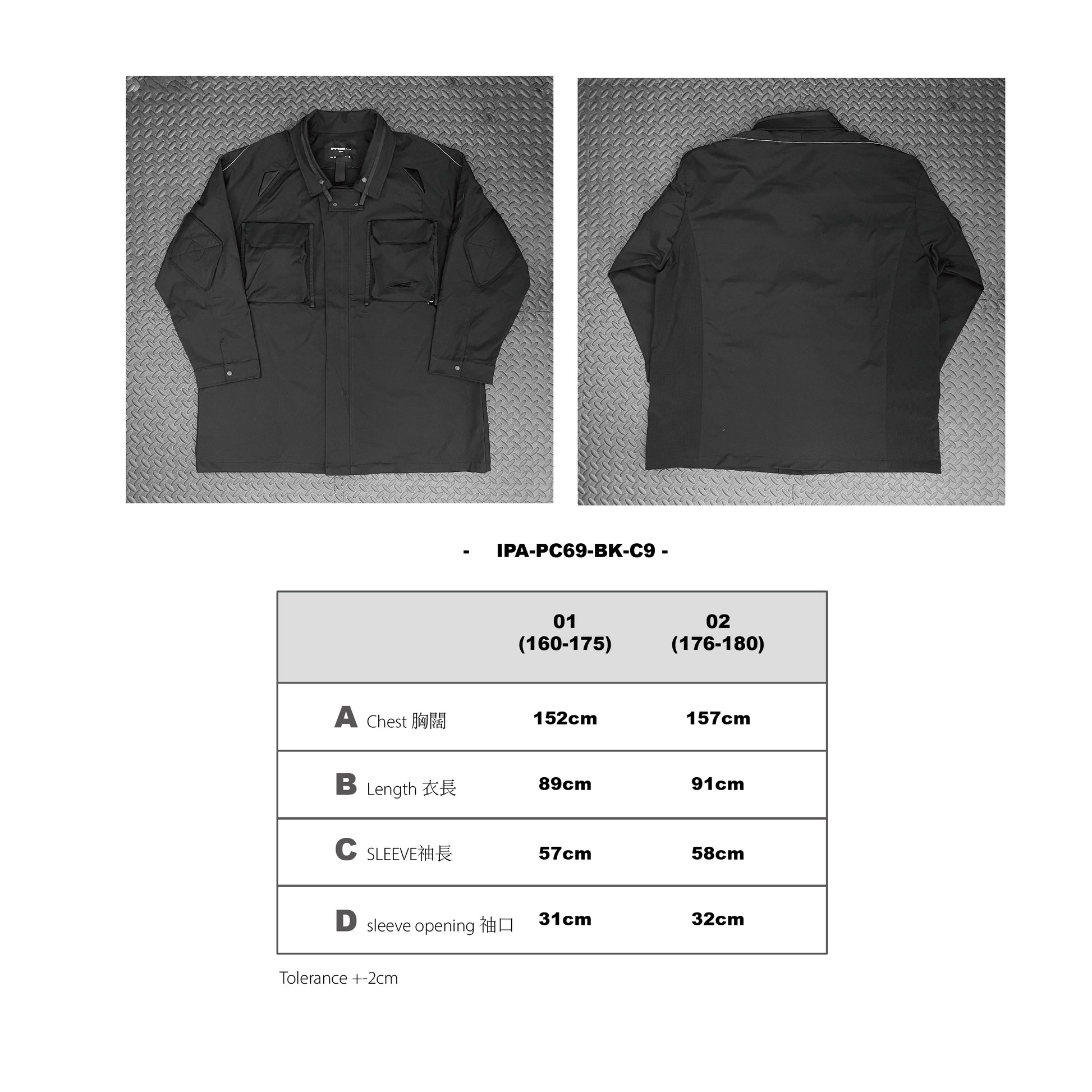 Inspired by German military uniforms, the coat features a silhouette that offers three collar styles: stand-up, turned-down, and suit collar. It combines traditional military design with futuristic elements.
